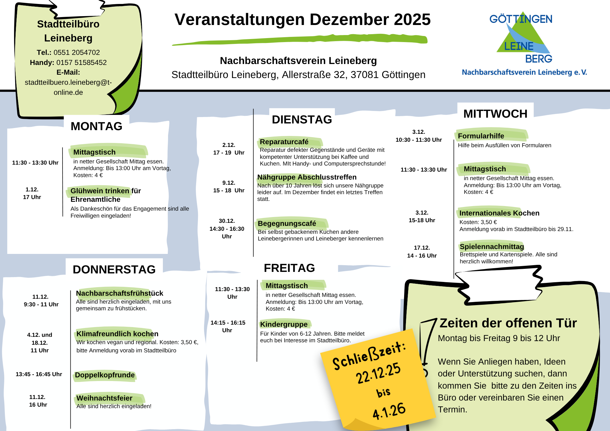 Das Stadtteilbüro ist ein Treffpunkt für alle Leinebergerinnen und Leineberger. Zusätzlich zum regelmäßigen Veranstaltungsangebot organisieren wir regelmäßig Veranstaltungen außer der Reihe wie z. B. Feste, Feiern, Workshops usw. Stöbern Sie gerne mal unter der Rubrik "Aktuelles", dort finden Sie alle Informationen zu den Veranstaltungen, die über das regelmäßige Angebobt hinaus gehen.