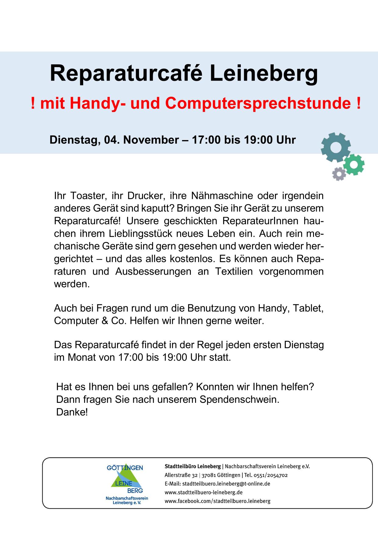 Das Leineberger Reparaturcafé sucht HelferInnen! ReparateurInnen für defekte Gegenstände und Geräte werden laufend gesucht. Daneben suchen wir ehrenamltiche Verstärkung vor allem für unser Organisationsteam. Hierfür werden keine handwerklichen Fähigkeiten benötigt. Die Aufgaben des Organationsteams sind: Vorbereitung der Veranstaltungen, Koordination der Reparateure, Organisation und AnsprechpartnerIn während des Repararcafés.