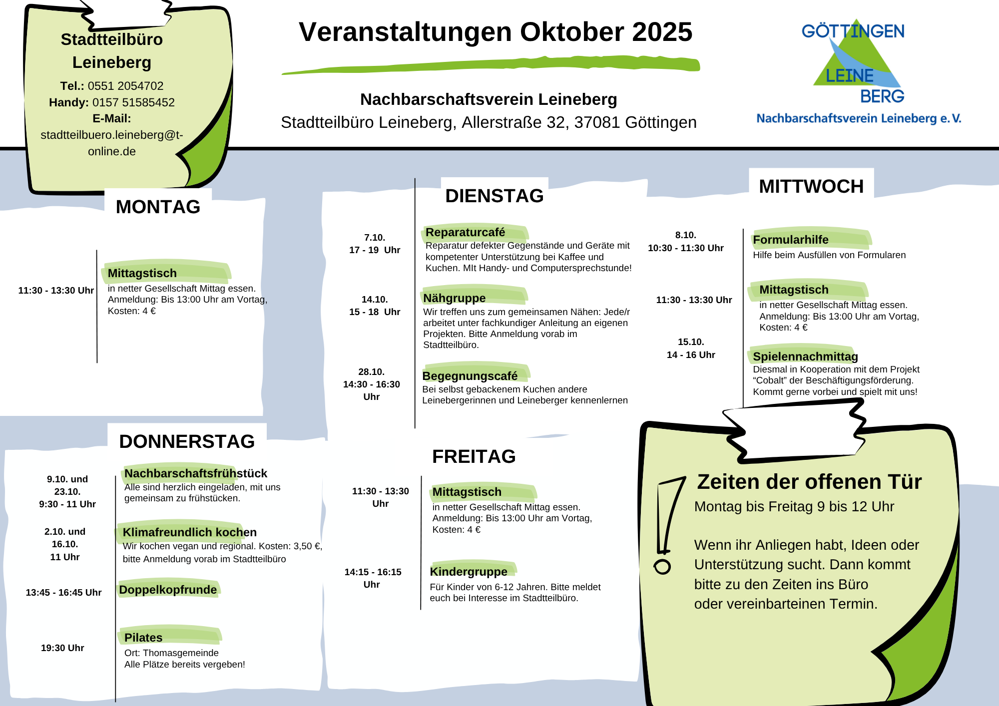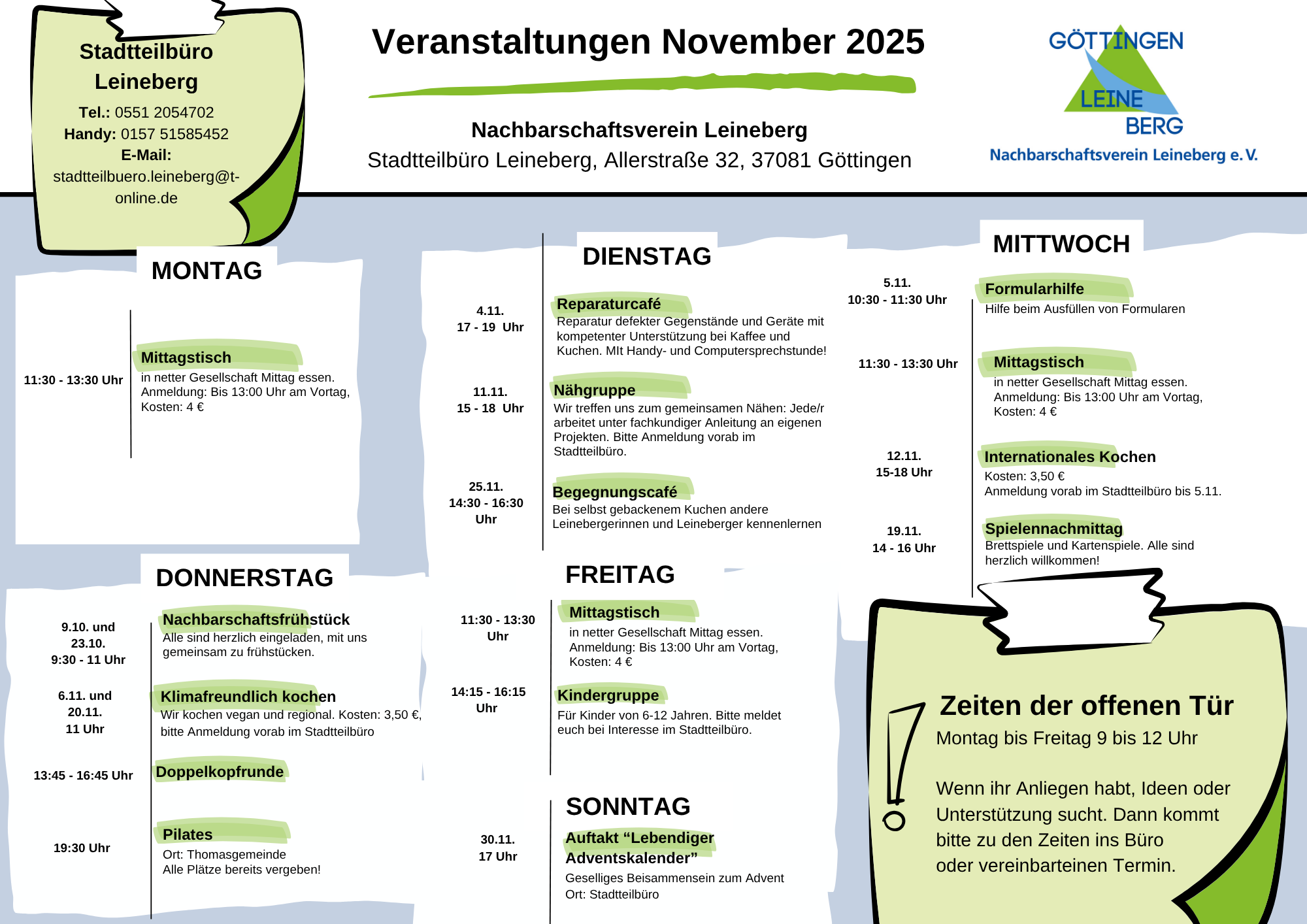 Das Stadtteilbüro ist ein Treffpunkt für alle Leinebergerinnen und Leineberger. Zusätzlich zum regelmäßigen Veranstaltungsangebot organisieren wir regelmäßig Veranstaltungen außer der Reihe wie z. B. Feste, Feiern, Workshops usw. Stöbern Sie gerne mal unter der Rubrik "Aktuelles", dort finden Sie alle Informationen zu den Veranstaltungen, die über das regelmäßige Angebobt hinaus gehen.