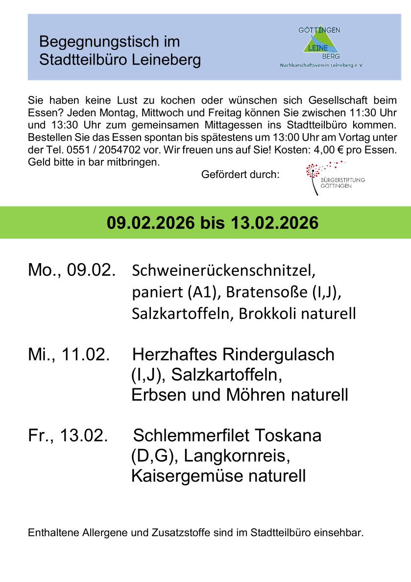 Um Voranmeldung bis 13:00 Uhr am Vortag wird gebeten: Tel.: 0551 - 2054702 oder per Email: stadtteilbuero.leineberg@t-online.de